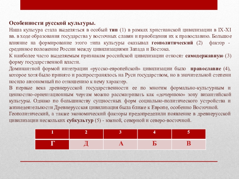 Особенности русской культуры.Наша культура стала выделяться в особый тип (1) в рамках христианской цивилизации в IX-XI вв.