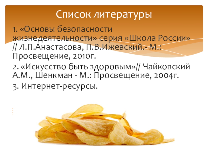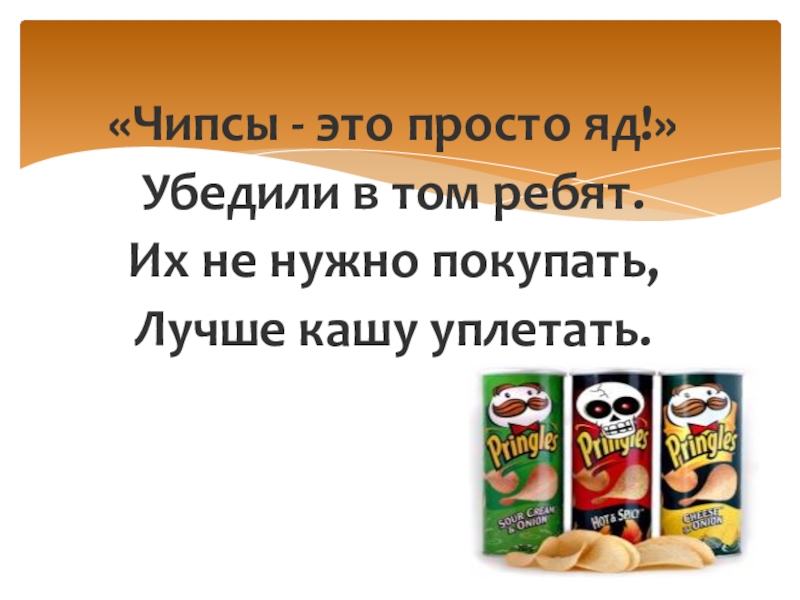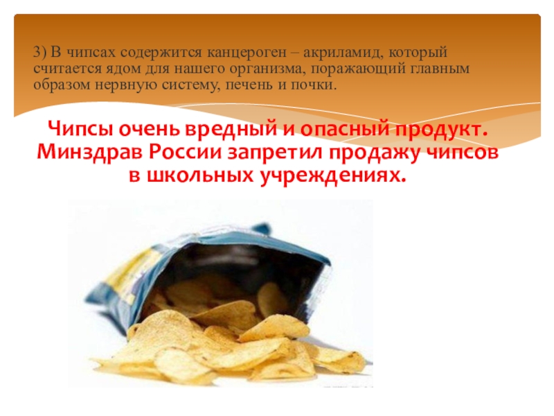 Чипсы очень вредный и опасный продукт. Минздрав России запретил продажу чипсов в школьных учреждениях.