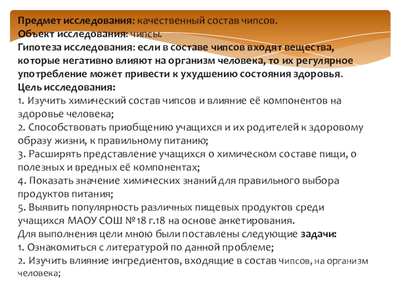 1. Изучить химический состав чипсов и влияние её компонентов на здоровье человека;