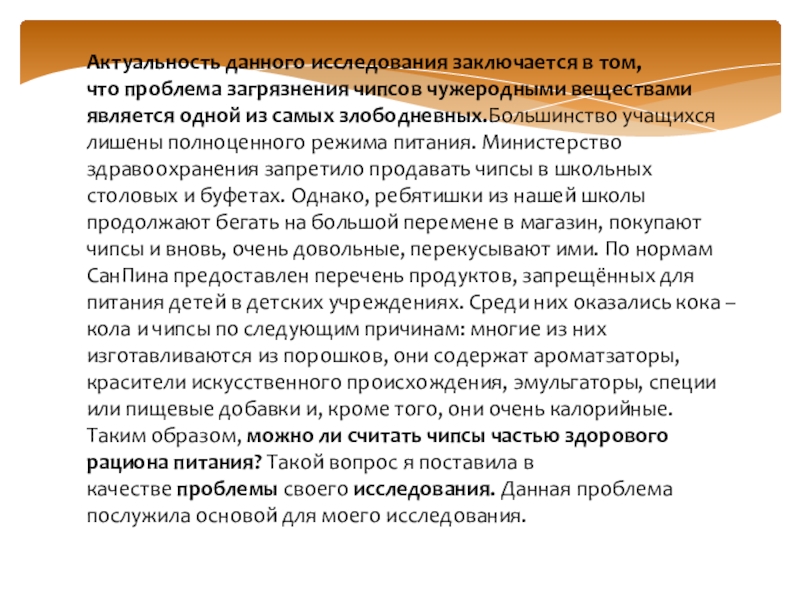 является одной из самых злободневных.Большинство учащихся лишены полноценного режима питания. Министерство здравоохранения запретило продавать чипсы в школьных столовых и буфетах. Однако, ребятишки из нашей школы продолжают бегать на большой перемене в магазин, покупают чипсы и вновь, очень довольные, перекусывают ими. По нормам СанПина предоставлен перечень продуктов, запрещённых для питания детей в детских учреждениях. Среди них оказались кока – кола и чипсы по следующим причинам: многие из них изготавливаются из порошков, они содержат ароматзаторы, красители искусственного происхождения, эмульгаторы, специи или пищевые добавки и, кроме того, они очень калорийные.