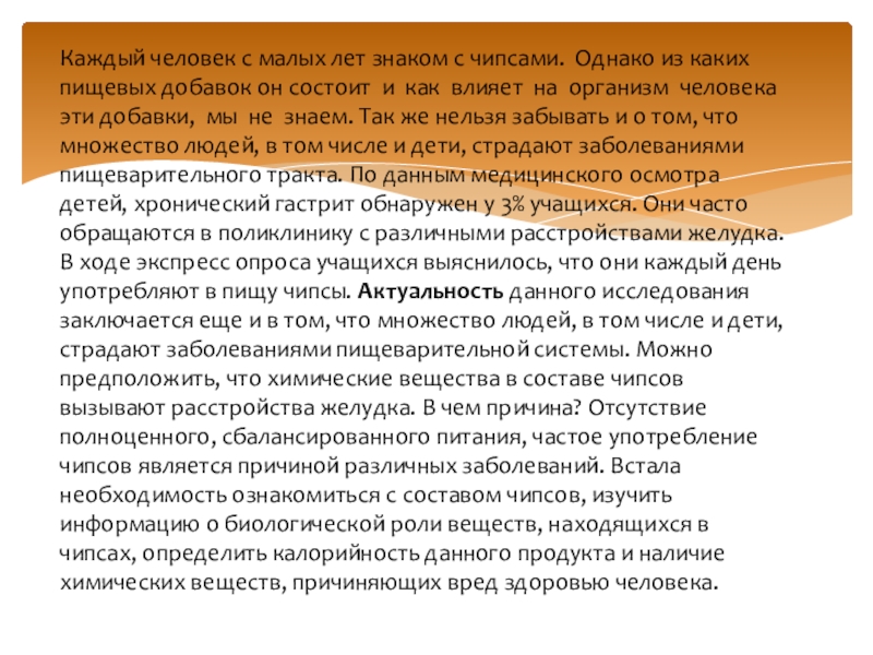 Однако из каких пищевых добавок он состоит и как влияет на организм человека эти добавки, мы не знаем. Так же нельзя забывать и о том, что множество людей, в том числе и дети, страдают заболеваниями пищеварительного тракта. По данным медицинского осмотра детей, хронический гастрит обнаружен у 3% учащихся. Они часто обращаются в поликлинику с различными расстройствами желудка. В ходе экспресс опроса учащихся выяснилось, что они каждый день употребляют в пищу чипсы. Актуальность данного исследования заключается еще и в том, что множество людей, в том числе и дети, страдают заболеваниями пищеварительной системы. Можно предположить, что химические вещества в составе чипсов вызывают расстройства желудка. В чем причина? Отсутствие полноценного, сбалансированного питания, частое употребление чипсов является причиной различных заболеваний. Встала необходимость ознакомиться с составом чипсов, изучить информацию о биологической роли веществ, находящихся в чипсах, определить калорийность данного продукта и наличие химических веществ, причиняющих вред здоровью человека.