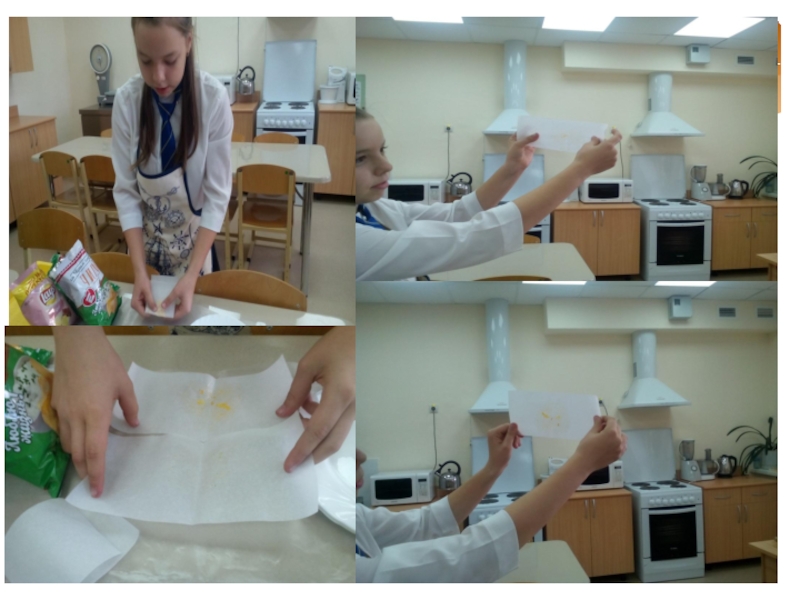 На каждом образце фильтровальной бумаги становятся видны жирные пятна. Заполняя пространство между волокнами бумаги, масла - иммерсионные жидкости – уменьшают рассеяние света бумагой. Чем больше жира содержит продукт, тем больше размер пропускающего свет пятна.