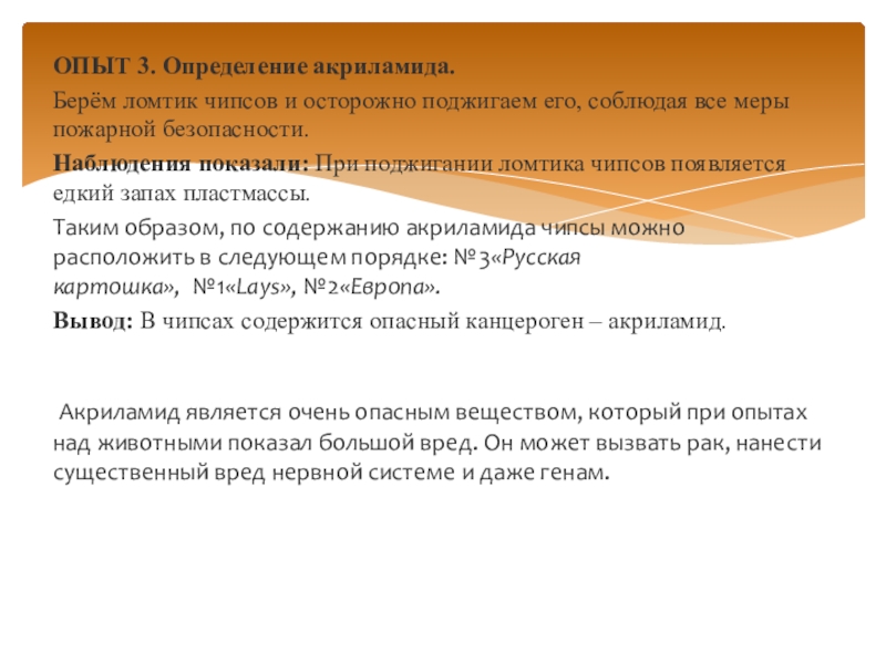 Вывод: В чипсах содержится опасный канцероген – акриламид.
