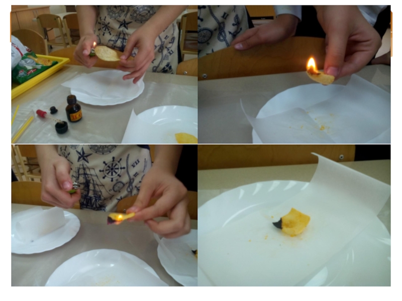 Берём ломтик чипсов и осторожно поджигаем его, соблюдая все