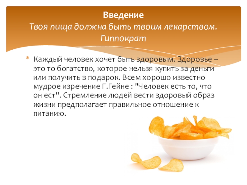 нельзя купить за деньги или получить в подарок. Всем хорошо известно мудрое изречение Г.Гейне : "Человек есть то, что он ест". Стремление людей вести здоровый образ жизни предполагает правильное отношение к питанию.