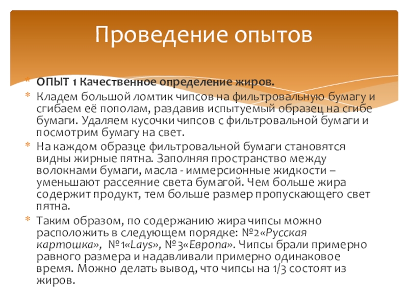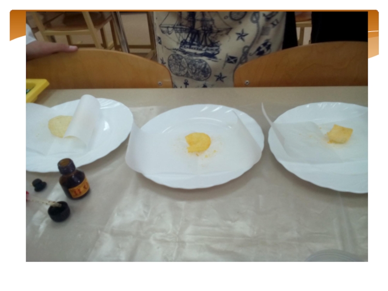 Таким образом, по содержанию жира чипсы можно расположить в следующем порядке: №2«Русская картошка», №1«Lаys», №3«Eвропа». Чипсы брали примерно равного размера и надавливали примерно одинаковое время. Можно делать вывод, что чипсы на 1/3 состоят из жиров.
