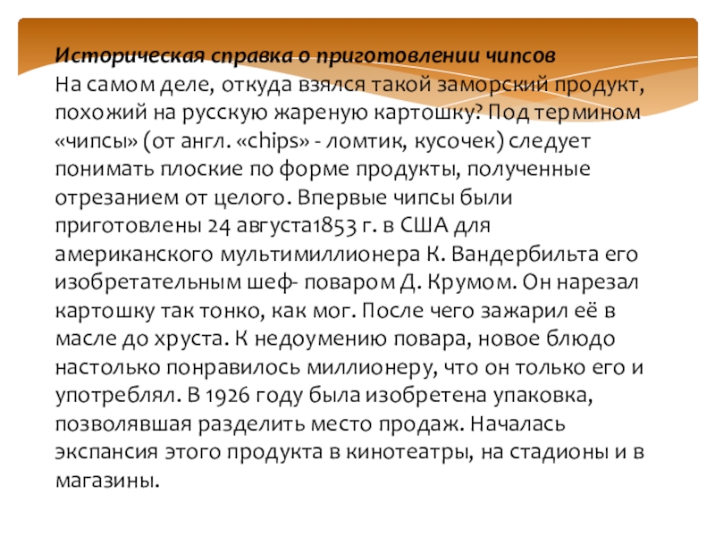 продукт, похожий на русскую жареную картошку? Под термином «чипсы» (от англ. «chips» - ломтик, кусочек) следует понимать плоские по форме продукты, полученные отрезанием от целого. Впервые чипсы были приготовлены 24 августа1853 г. в США для американского мультимиллионера К. Вандербильта его изобретательным шеф- поваром Д. Крумом. Он нарезал картошку так тонко, как мог. После чего зажарил её в масле до хруста. К недоумению повара, новое блюдо настолько понравилось миллионеру, что он только его и употреблял. В 1926 году была изобретена упаковка, позволявшая разделить место продаж. Началась экспансия этого продукта в кинотеатры, на стадионы и в магазины.