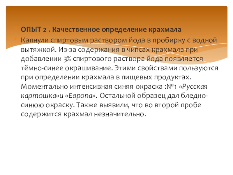 Слайд 11ОПЫТ 2 . Качественное определение крахмала