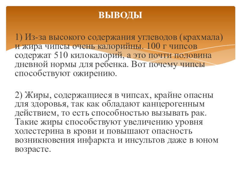 2) Жиры, содержащиеся в чипсах, крайне опасны для здоровья, так как обладают канцерогенным действием, то есть способностью вызывать рак. Такие жиры способствуют увеличению уровня холестерина в крови и повышают опасность возникновения инфаркта и инсультов даже в юном возрасте.