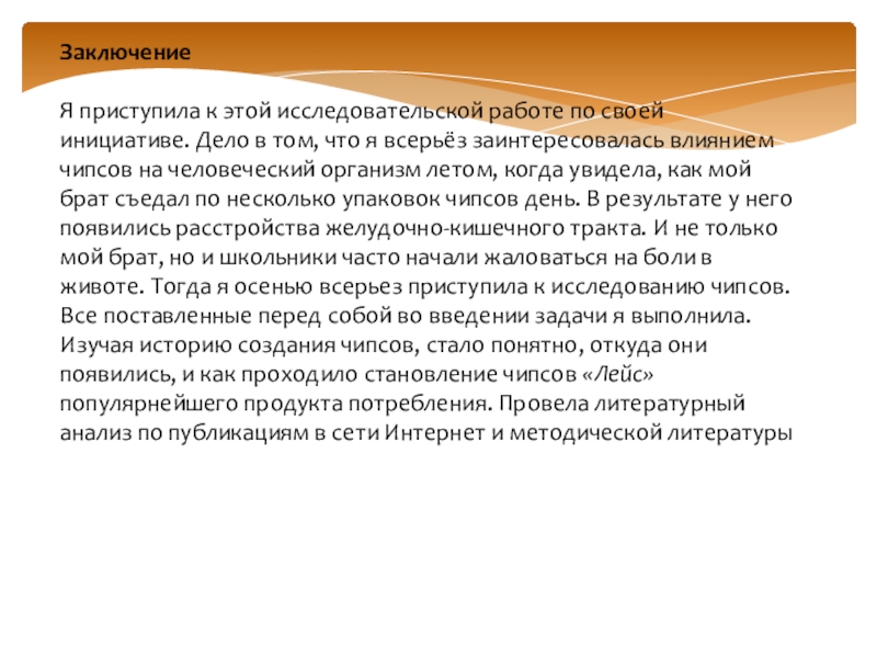Все поставленные перед собой во введении задачи я выполнила. Изучая историю создания чипсов, стало понятно, откуда они появились, и как проходило становление чипсов «Лейс» популярнейшего продукта потребления. Провела литературный анализ по публикациям в сети Интернет и методической литературы