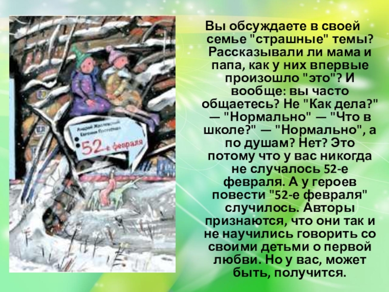 папа, как у них впервые произошло "это"? И вообще: вы часто общаетесь? Не "Как дела?" — "Нормально" — "Что в школе?" — "Нормально", а по душам? Нет? Это потому что у вас никогда не случалось 52-е февраля. А у героев повести "52-е февраля" случилось. Авторы признаются, что они так и не научились говорить со своими детьми о первой любви. Но у вас, может быть, получится.
