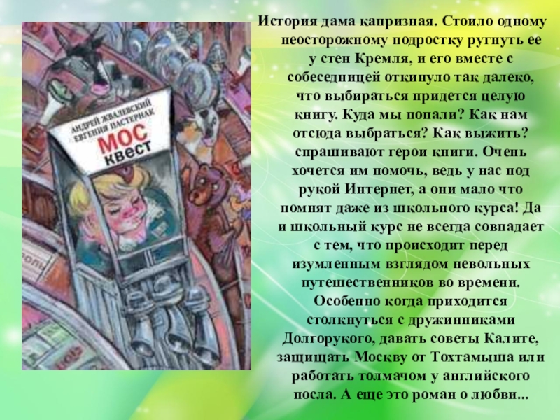 Кремля, и его вместе с собеседницей откинуло так далеко, что выбираться придется целую книгу. Куда мы попали? Как нам отсюда выбраться? Как выжить? спрашивают герои книги. Очень хочется им помочь, ведь у нас под рукой Интернет, а они мало что помнят даже из школьного курса! Да и школьный курс не всегда совпадает с тем, что происходит перед изумленным взглядом невольных путешественников во времени. Особенно когда приходится столкнуться с дружинниками Долгорукого, давать советы Калите, защищать Москву от Тохтамыша или работать толмачом у английского посла. А еще это роман о любви...