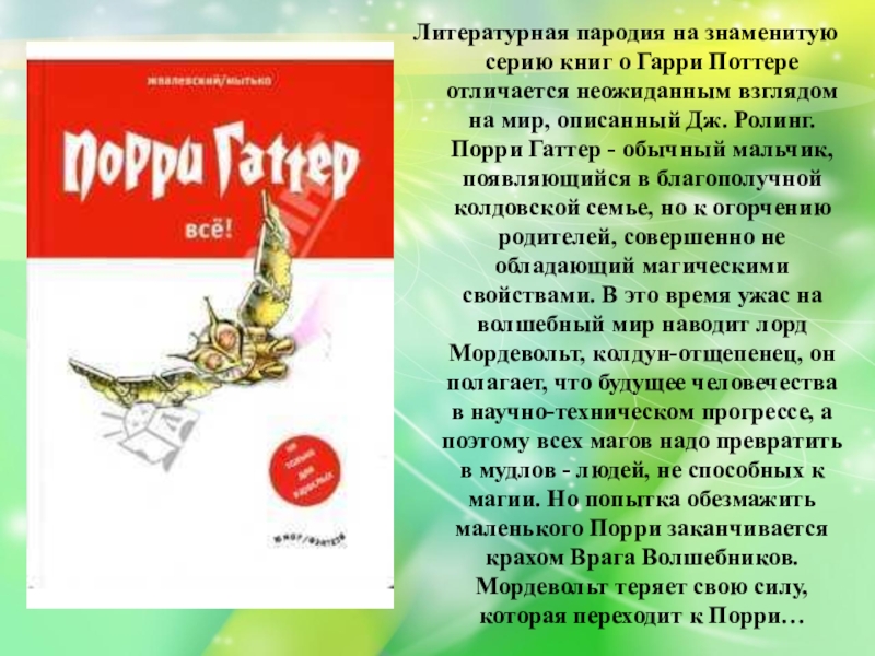 Слайд 19Литературная пародия на знаменитую серию книг о Гарри Поттере отличается неожиданным