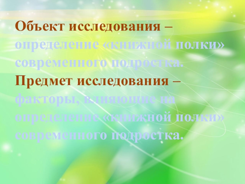 Слайд 3Объект исследования – определение «книжной полки» современного подростка.