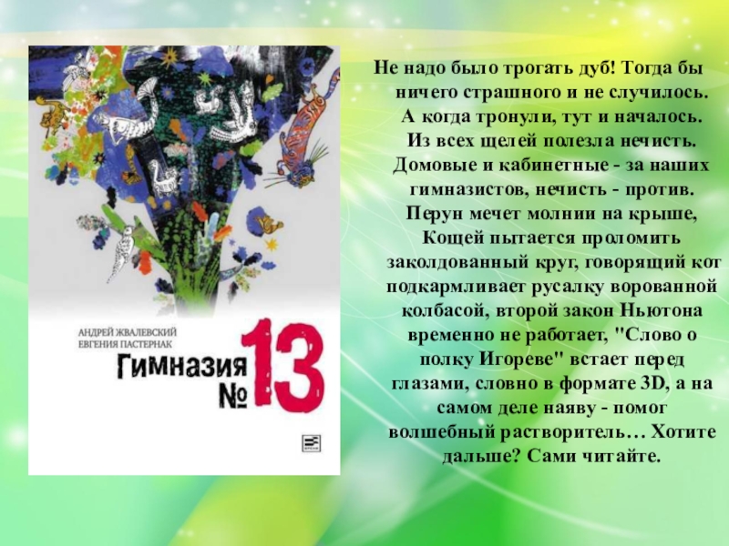 случилось. А когда тронули, тут и началось. Из всех щелей полезла нечисть. Домовые и кабинетные - за наших гимназистов, нечисть - против. Перун мечет молнии на крыше, Кощей пытается проломить заколдованный круг, говорящий кот подкармливает русалку ворованной колбасой, второй закон Ньютона временно не работает, "Слово о полку Игореве" встает перед глазами, словно в формате 3D, а на самом деле наяву - помог волшебный растворитель… Хотите дальше? Сами читайте.
