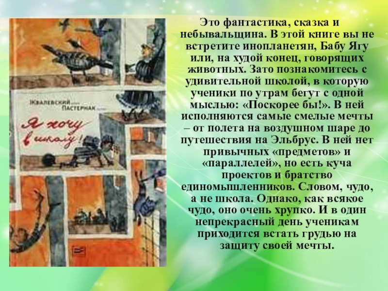 инопланетян, Бабу Ягу или, на худой конец, говорящих животных. Зато познакомитесь с удивительной школой, в которую ученики по утрам бегут с одной мыслью: «Поскорее бы!». В ней исполняются самые смелые мечты – от полета на воздушном шаре до путешествия на Эльбрус. В ней нет привычных «предметов» и «параллелей», но есть куча проектов и братство единомышленников. Словом, чудо, а не школа. Однако, как всякое чудо, оно очень хрупко. И в один непрекрасный день ученикам приходится встать грудью на защиту своей мечты.