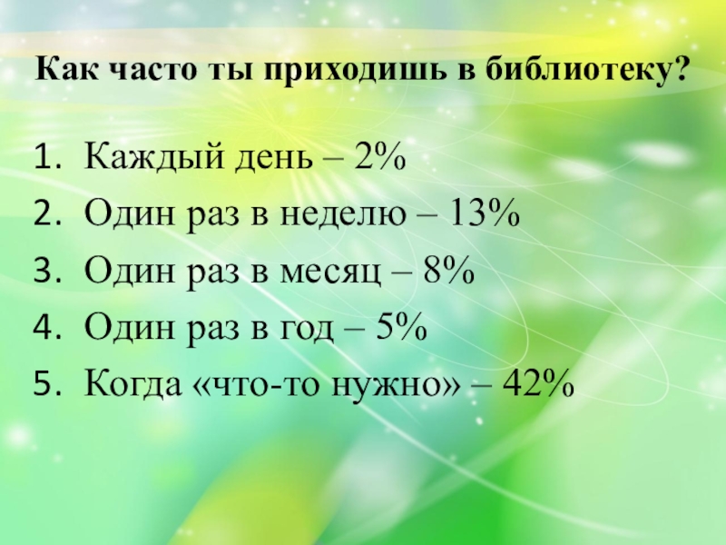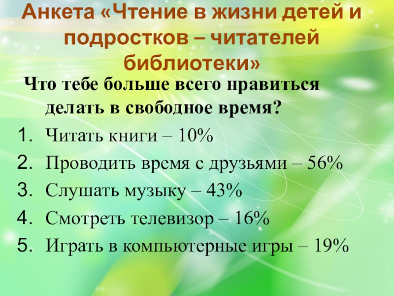 Слайд 6Анкета «Чтение в жизни детей и подростков – читателей библиотеки»