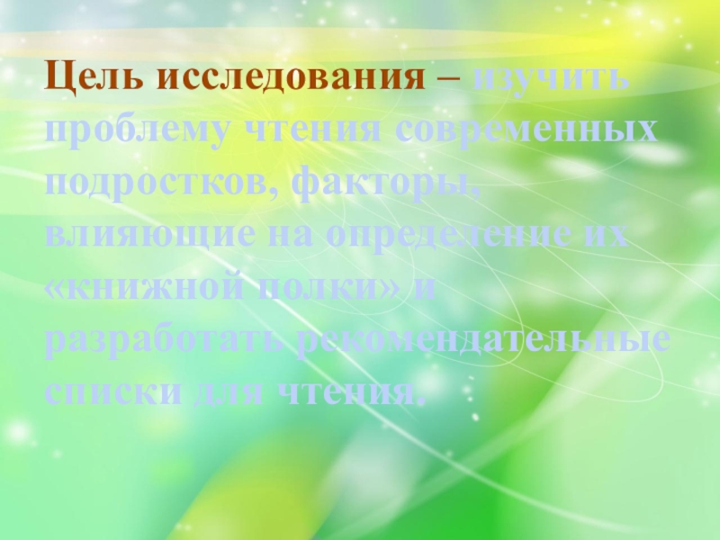 Слайд 4Цель исследования – изучить проблему чтения современных подростков, факторы, влияющие на