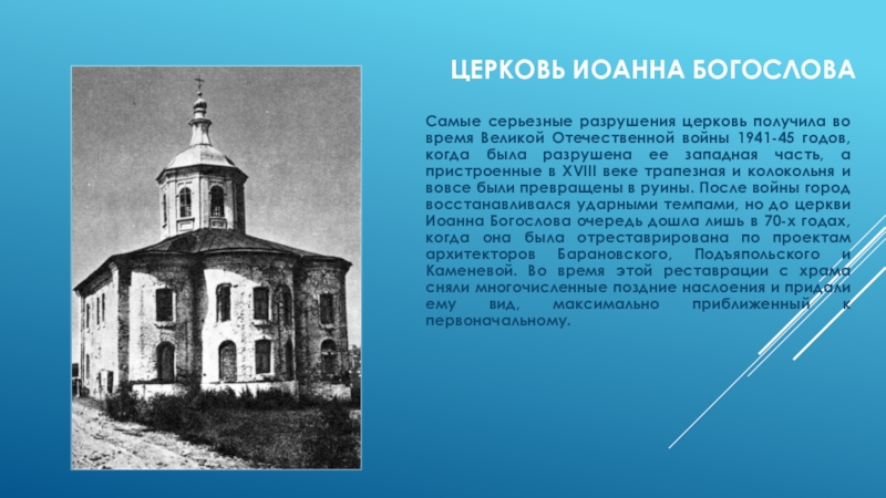войны 1941-45 годов, когда была разрушена ее западная часть, а пристроенные в XVIII веке трапезная и колокольня и вовсе были превращены в руины. После войны город восстанавливался ударными темпами, но до церкви Иоанна Богослова очередь дошла лишь в 70-х годах, когда она была отреставрирована по проектам архитекторов Барановского, Подъяпольского и Каменевой. Во время этой реставрации с храма сняли многочисленные поздние наслоения и придали ему вид, максимально приближенный к первоначальному.