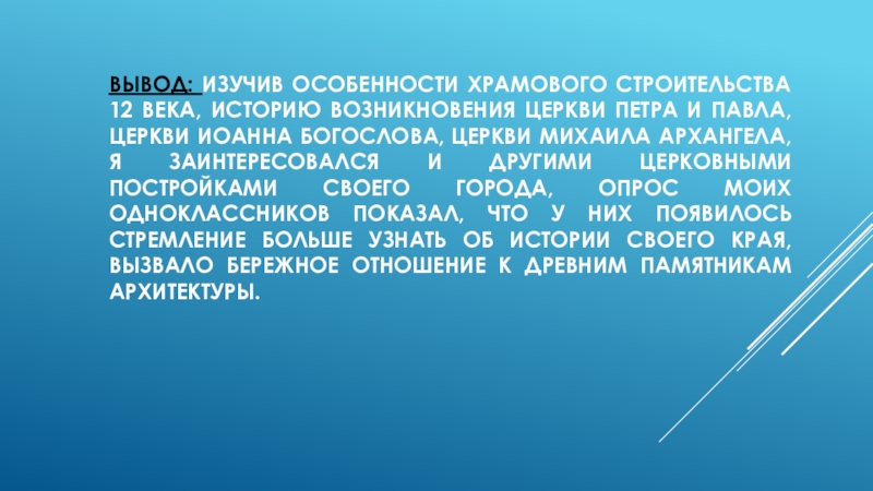 Слайд 18Вывод: изучив особенности храмового строительства 12 века, историю возникновения церкви Петра