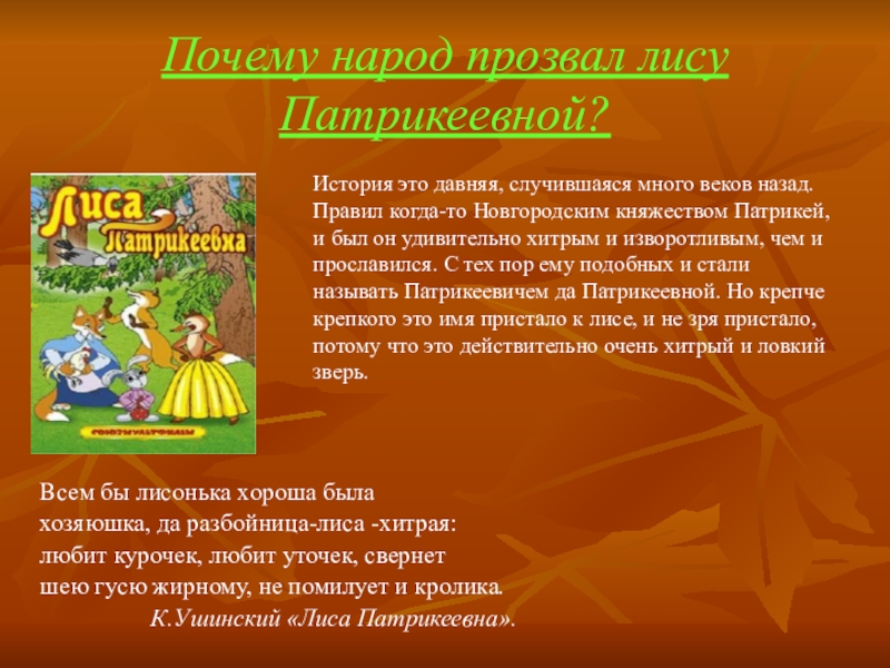 История это давняя, случившаяся много веков назад. Правил когда-то Новгородским княжеством Патрикей, и был он удивительно хитрым и изворотливым, чем и прославился. С тех пор ему подобных и стали называть Патрикеевичем да Патрикеевной. Но крепче крепкого это имя пристало к лисе, и не зря пристало, потому что это действительно очень хитрый и ловкий зверь.
