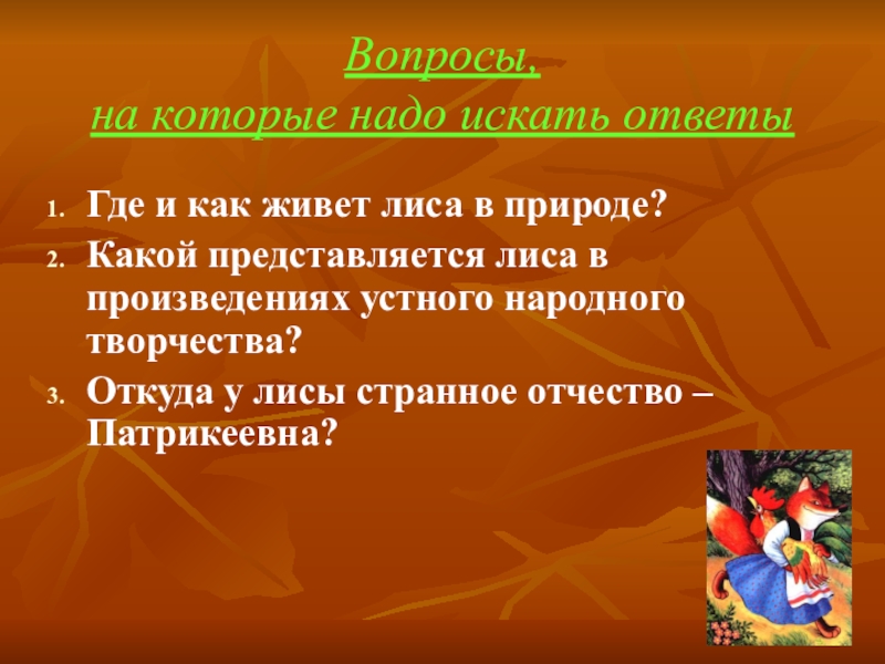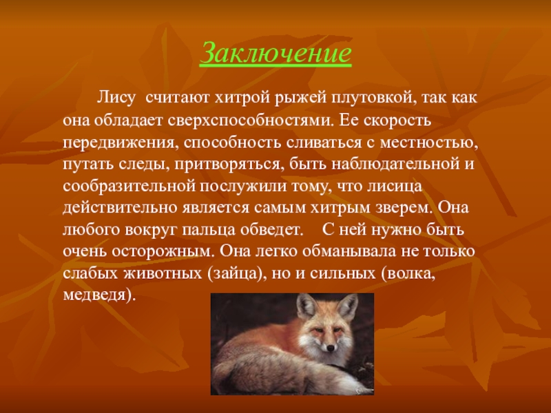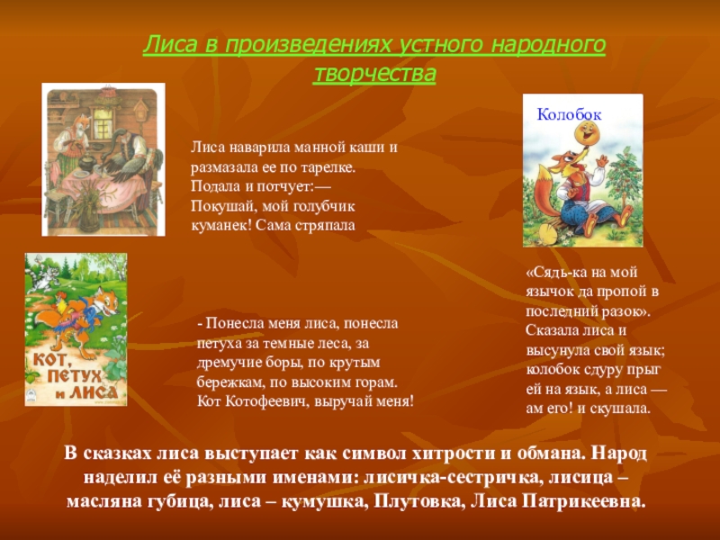 В сказках лиса выступает как символ хитрости и обмана. Народ наделил её разными именами: лисичка-сестричка, лисица – масляна губица, лиса – кумушка, Плутовка, Лиса Патрикеевна.