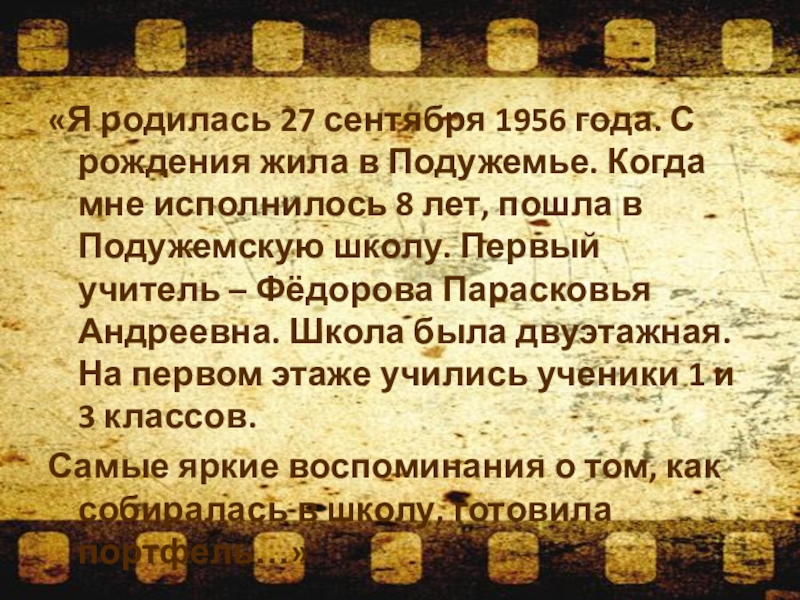 «Я родилась 27 сентября 1956 года. С рождения жила в Подужемье.