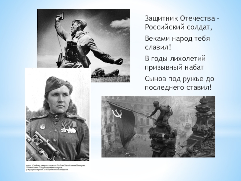 Защитник Отечества – Российский солдат,Веками народ тебя славил!В годы лихолетий призывный набатСынов под ружье до последнего ставил!