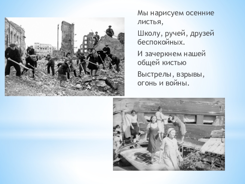 Мы нарисуем осенние листья,Школу, ручей, друзей беспокойных.И зачеркнем нашей общей кистьюВыстрелы, взрывы, огонь и войны.