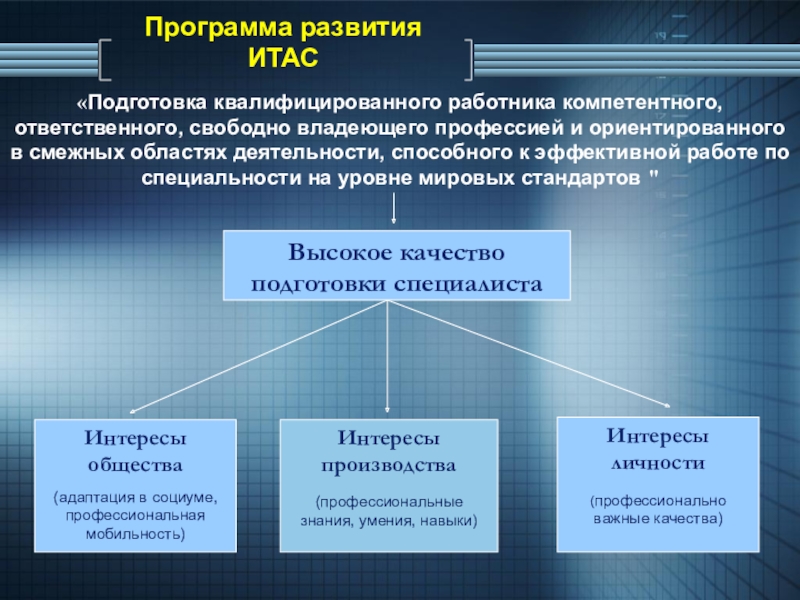 «Подготовка квалифицированного работника компетентного, ответственного, свободно владеющего профессией и ориентированного в смежных областях деятельности, способного к эффективной работе по специальности на уровне мировых стандартов "