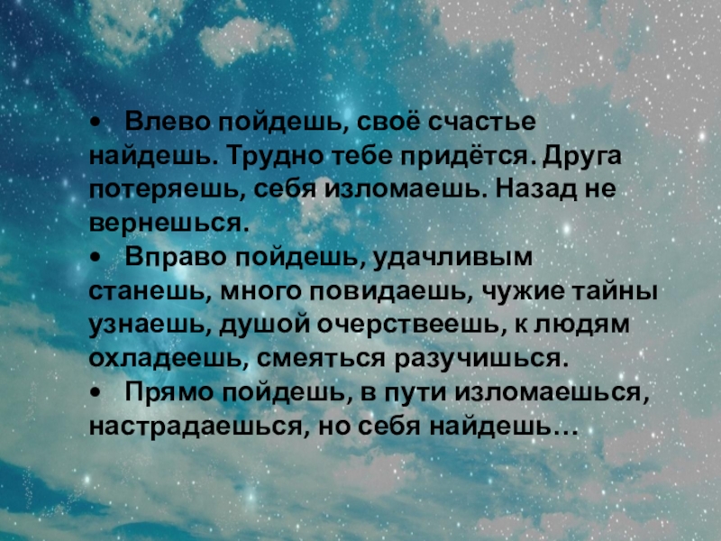 Слайд 2• Влево пойдешь, своё счастье найдешь. Трудно тебе придётся. Друга потеряешь, себя