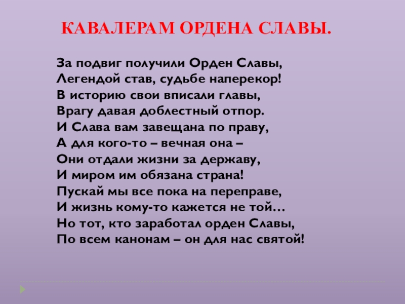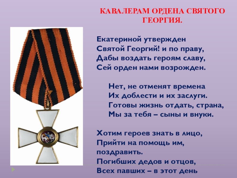 Святой Георгий! и по праву, Дабы воздать героям славу, Сей орден нами возрожден.