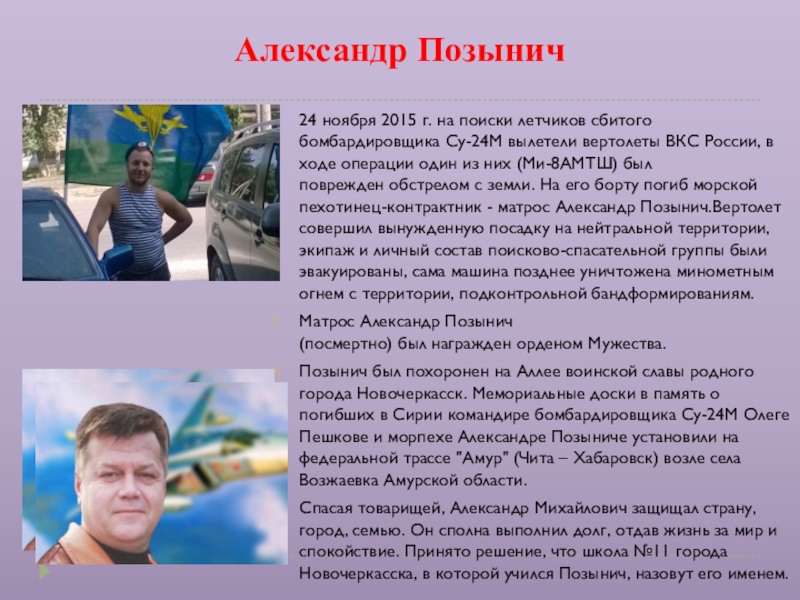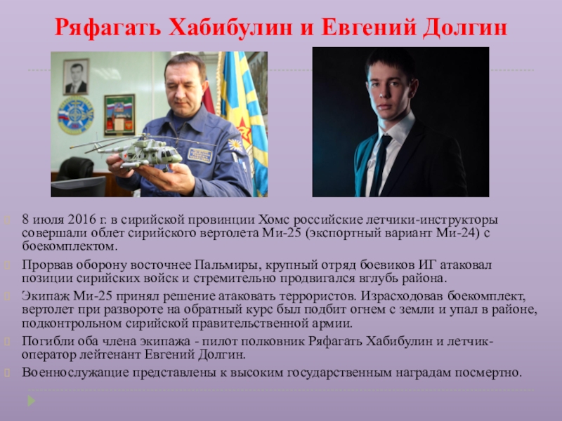 - 38-летний командир вертолета Андрей Окладников и штурман вертолета Виктор Панков погибли 12 апреля 2016 года;