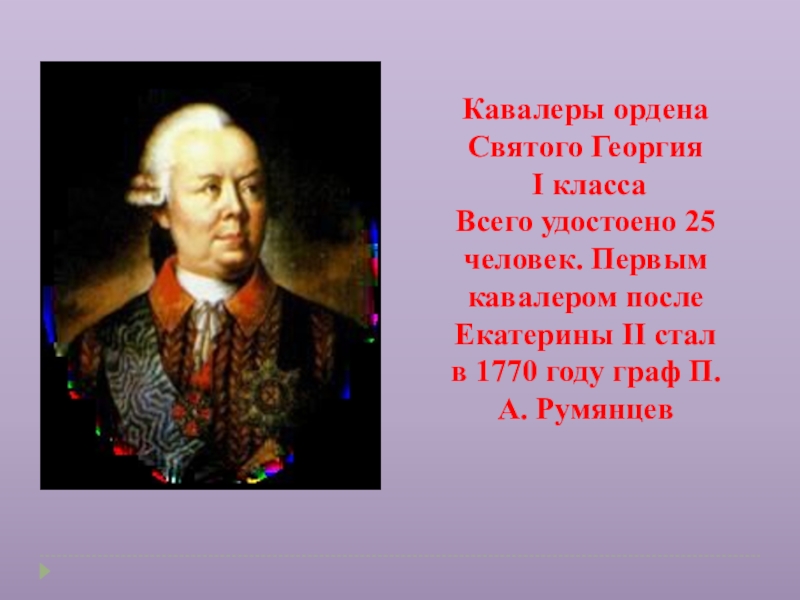 кавалером после Екатерины II стал в 1770 году граф П. А. Румянцев