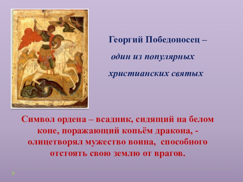 Слайд 6Символ ордена – всадник, сидящий на белом коне, поражающий копьём дракона,
