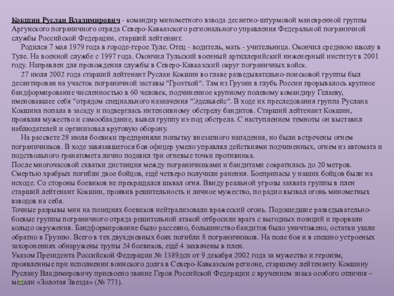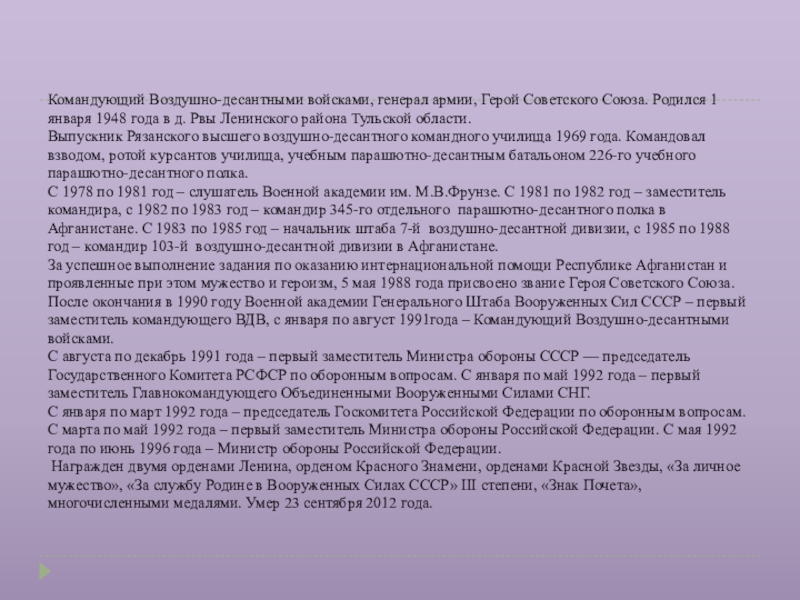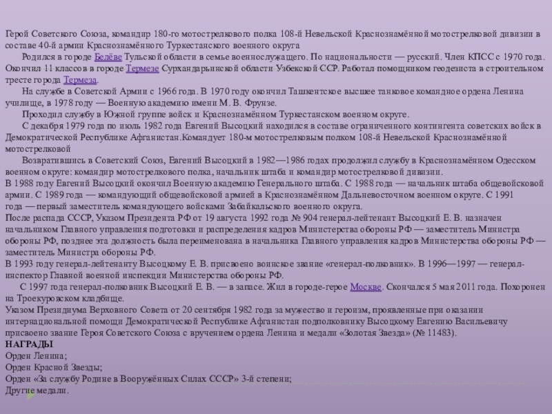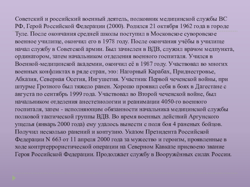Слайд 47Советский и российский военный деятель, полковник медицинской службы ВС РФ, Герой