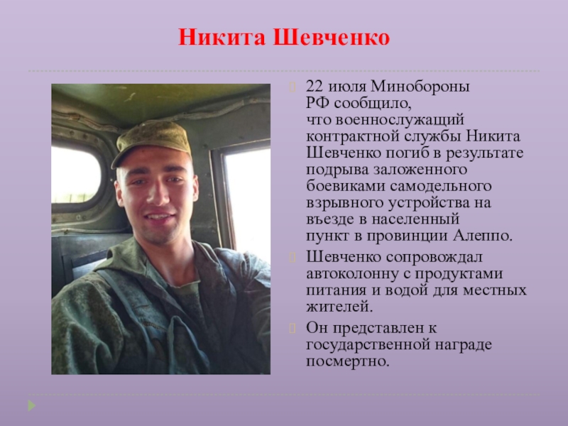 22 июля Минобороны РФ сообщило, что военнослужащий контрактной службы Никита Шевченко погиб в