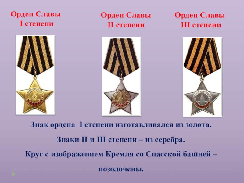 II степень – крест на шее на ленте шириной 5 см, звезду на левой стороне груди.