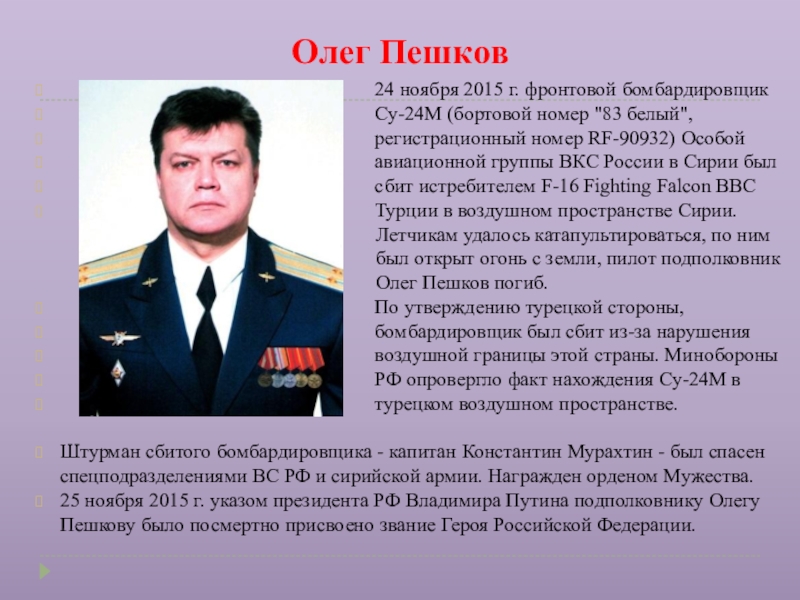 25 ноября 2015 г. указом президента РФ Владимира Путина подполковнику Олегу Пешкову было посмертно присвоено звание Героя Российской Федерации.