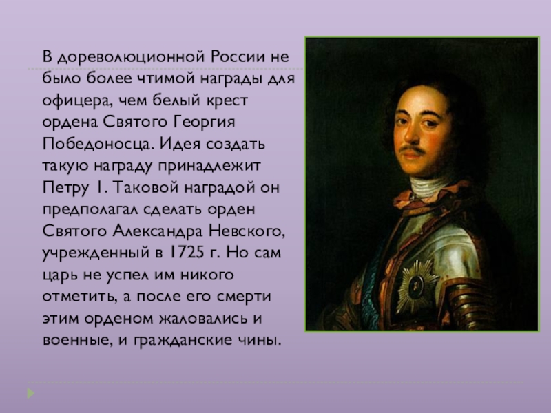 белый крест ордена Святого Георгия Победоносца. Идея создать такую награду принадлежит Петру 1. Таковой наградой он предполагал сделать орден Святого Александра Невского, учрежденный в 1725 г. Но сам царь не успел им никого отметить, а после его смерти этим орденом жаловались и военные, и гражданские чины.