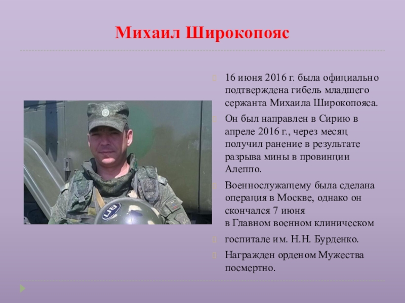 16 июня 2016 г. была официально подтверждена гибель младшего сержанта Михаила Широкопояса.