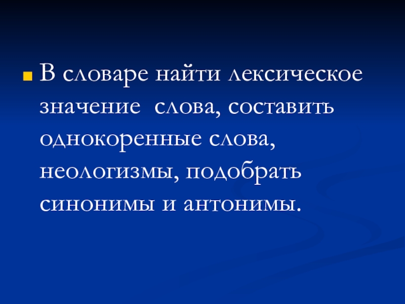 В словаре найти лексическое значение слова, составить однокоренные слова, неологизмы, подобрать синонимы и антонимы.