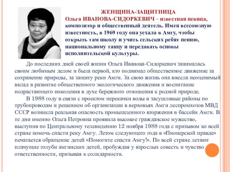 известность, в 1969 году она уехала в Амгу, чтобы открыть там школу и учить сельских ребят пению, национальному танцу и передавать основы исполнительской культуры.
