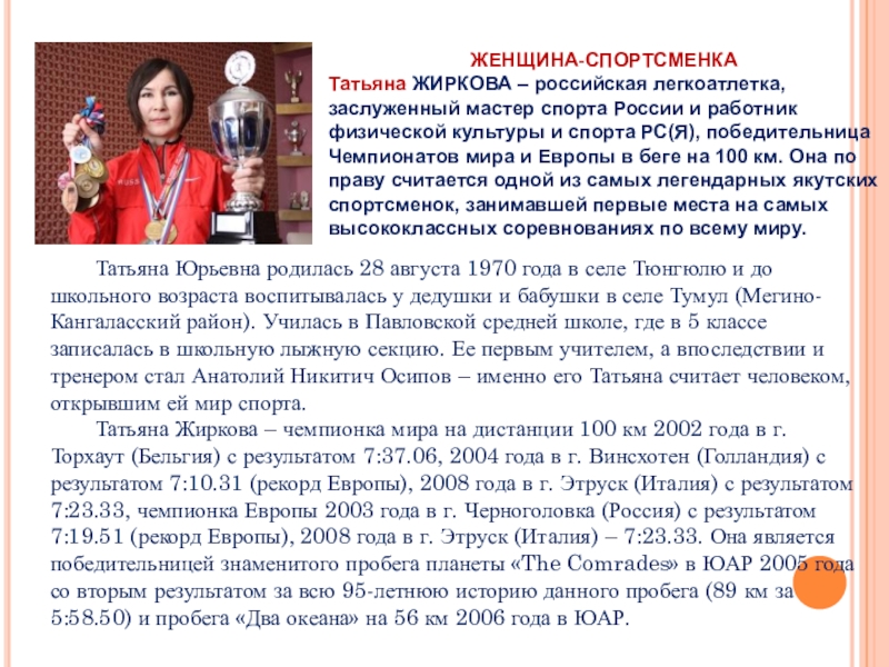 Татьяна Жиркова – чемпионка мира на дистанции 100 км 2002 года в г. Торхаут (Бельгия) с результатом 7:37.06, 2004 года в г. Винсхотен (Голландия) с результатом 7:10.31 (рекорд Европы), 2008 года в г. Этруск (Италия) с результатом 7:23.33, чемпионка Европы 2003 года в г. Черноголовка (Россия) с результатом 7:19.51 (рекорд Европы), 2008 года в г. Этруск (Италия) – 7:23.33. Она является победительницей знаменитого пробега планеты «The Comrades» в ЮАР 2005 года со вторым результатом за всю 95-летнюю историю данного пробега (89 км за 5:58.50) и пробега «Два океана» на 56 км 2006 года в ЮАР.