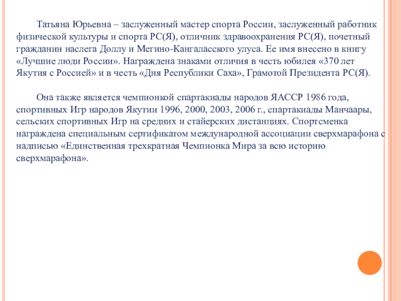 Слайд 15 Татьяна Юрьевна – заслуженный мастер спорта России, заслуженный работник физической культуры