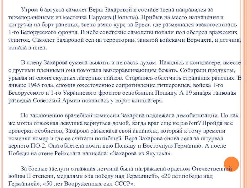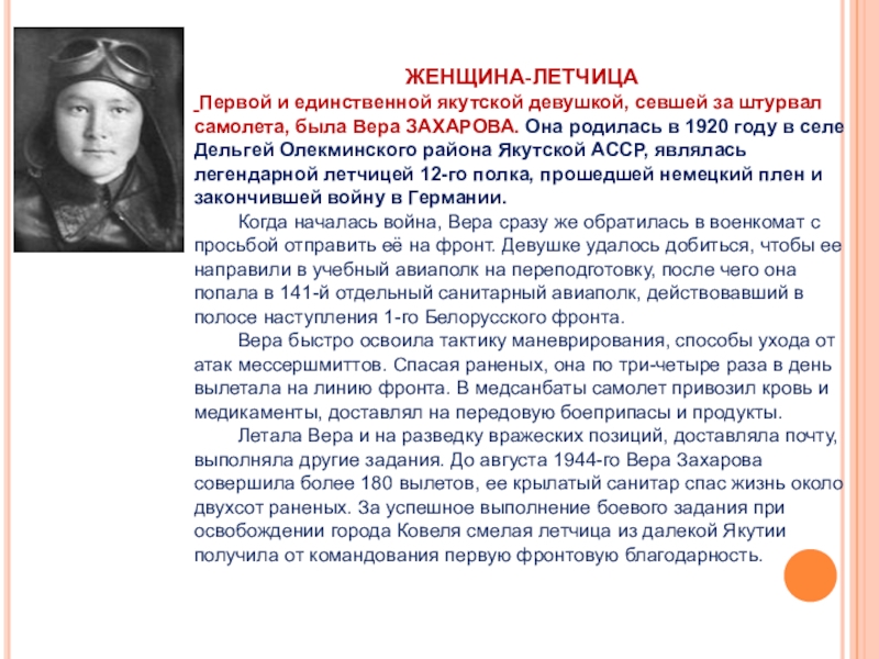 ЗАХАРОВА. Она родилась в 1920 году в селе Дельгей Олекминского района Якутской АССР, являлась легендарной летчицей 12-го полка, прошедшей немецкий плен и закончившей войну в Германии.