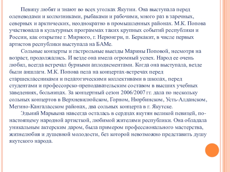 оленеводами и колхозниками, рыбаками и рабочими, много раз в заречных, северных и арктических, неоднократно в промышленных районах. М.К. Попова участвовала в культурных программах таких крупных событий республики и России, как открытие г. Мирного, г. Нерюнгри, п. Беркакит, в числе первых артистов республики выступала на БАМе.