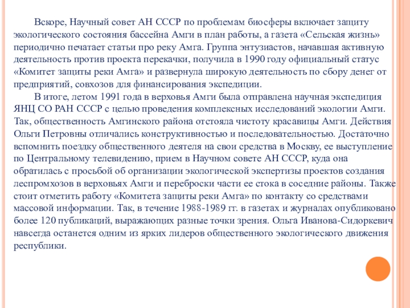 В итоге, летом 1991 года в верховья Амги была отправлена научная экспедиция ЯНЦ СО РАН СССР с целью проведения комплексных исследований экологии Амги. Так, общественность Амгинского района отстояла чистоту красавицы Амги. Действия Ольги Петровны отличались конструктивностью и последовательностью. Достаточно вспомнить поездку общественного деятеля на свои средства в Москву, ее выступление по Центральному телевидению, прием в Научном совете АН СССР, куда она обратилась с просьбой об организации экологической экспертизы проектов создания леспромхозов в верховьях Амги и переброски части ее стока в соседние районы. Также стоит отметить работу «Комитета защиты реки Амга» по контакту со средствами массовой информации. Так, в течение 1988-1989 гг. в газетах и журналах опубликовано более 120 публикаций, выражающих разные точки зрения. Ольга Иванова-Сидоркевич навсегда останется одним из ярких лидеров общественного экологического движения республики.