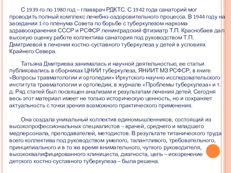 Слайд 5 С 1939-го по 1980 год – главврач РДКТС. С 1942 года