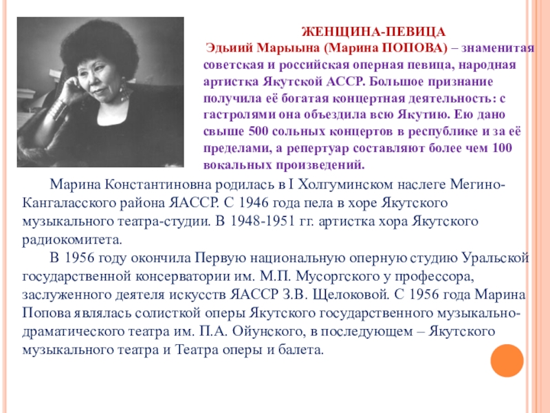 Эдьиий Марыына (Марина ПОПОВА) – знаменитая советская и российская оперная певица,